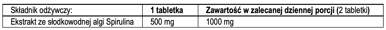 Składniki: ekstrakt z algi słodkowodnej spirulina - całe algi (Arthrospira platensis), emulgator: celuloza mikrokrystaliczna, maltodekstryna, emulgator: sole magnezowe kwasów tłuszczowych. Może zawierać skorupiaki.