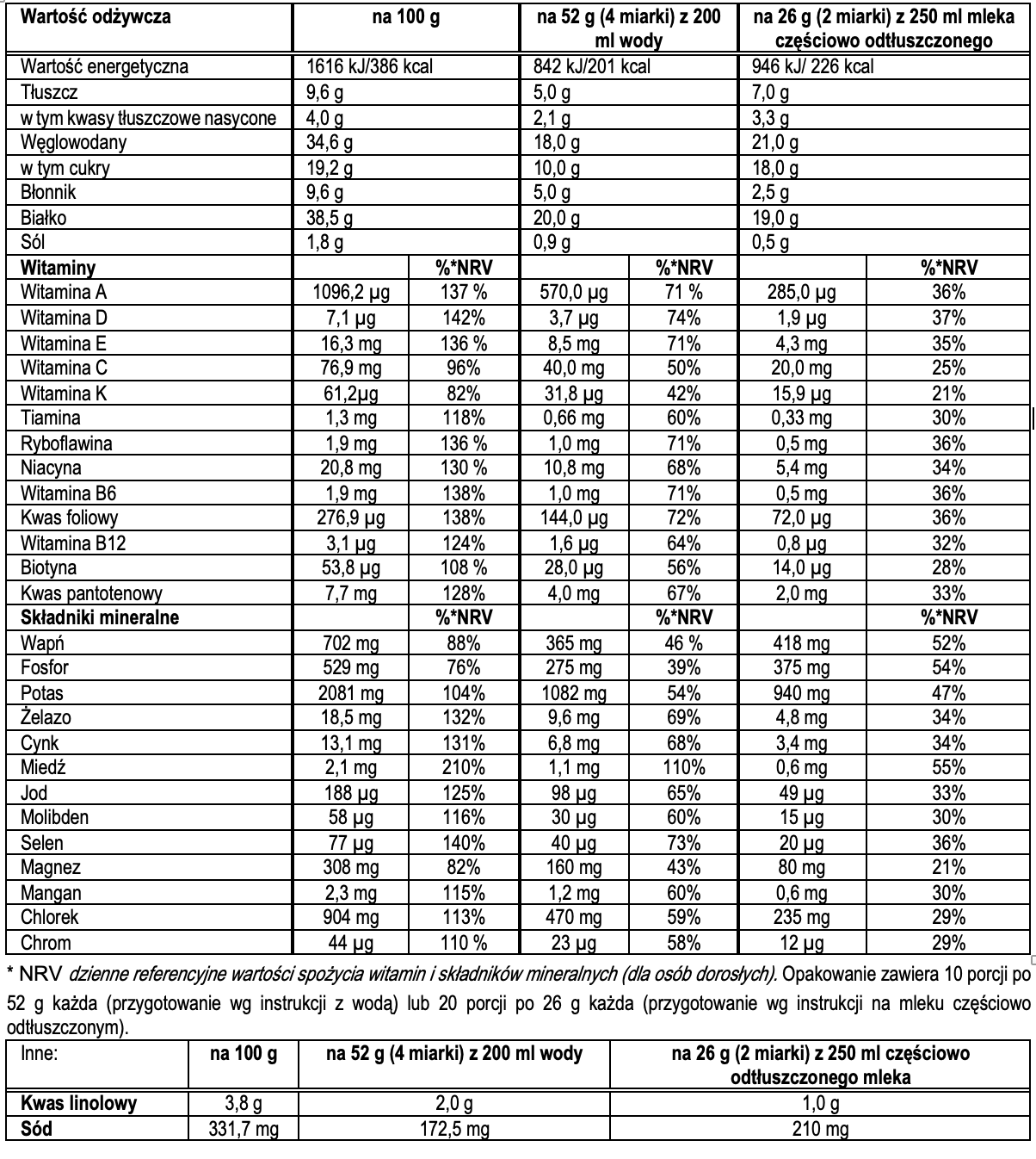 Sposób przygotowania: Zmieszać 4 miarki (52 g) mieszanki z 200 ml wody lub 2 miarki (26 g) mieszanki z 250 ml mleka częściowo odtłuszczonego (zawartość tłuszczu 1,5%). Dokładnie wstrząsnąć, aby uzyskać gładką i kremową konsystencję, a następnie spożyć.