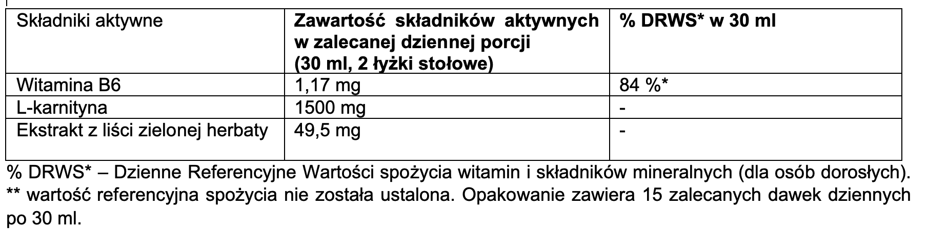 productDetail.codeSuplement diety z L-karnityną, ekstraktem z liści zielonej herbaty i witaminą B6, o smaku pomarańcza - marakuja, w płynie. Zawiera substancję słodzącą.