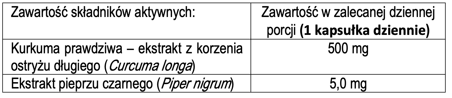 Składniki: Kurkuma prawdziwa – ekstrakt z korzenia ostryżu długiego (Curcuma longa), maltodekstryna, otoczka (substancja wypełniająca: hydroksypropylometyloceluloza), ekstrakt pieprzu czarnego (Piper nigrum), emulgator: sole magnezowe kwasów tłuszczowych, substancja przeciwzbrylająca: dwutlenek krzemu.