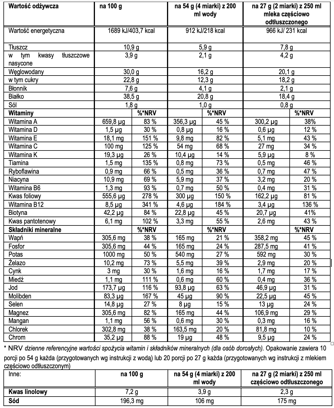 Sposób przygotowania: Wymieszać 4 miarki (54 g) mieszanki z 200 ml wody lub 2 miarki (27 g) mieszanki z 250 ml mleka częściowo odtłuszczonego. Dokładnie wstrząsnąć, aby uzyskać gładką i kremową konsystencję. Spożyć.