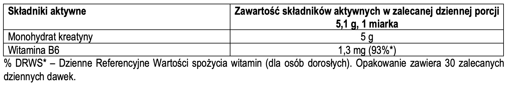 Składniki: monohydrat kreatyny, witamina B6 (chlorowodorek pirydoksyny).