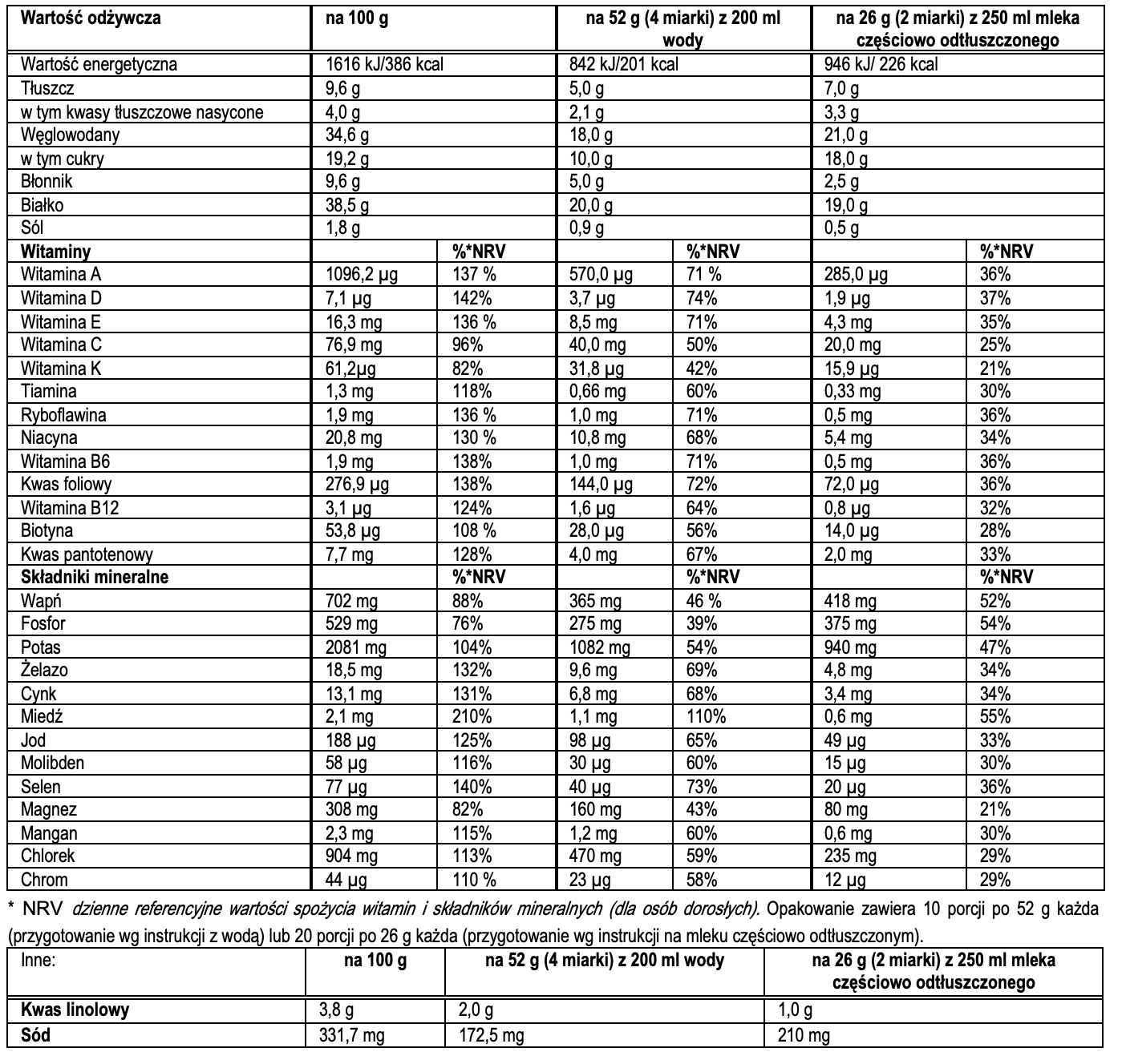 Sposób przygotowania: Zmieszać 4 miarki (52 g) mieszanki z 200 ml wody lub 2 miarki (26 g) mieszanki z 250 ml mleka częściowo odtłuszczonego (zawartość tłuszczu 1,5%). Dokładnie wstrząsnąć, aby uzyskać gładką i kremową konsystencję, a następnie spożyć.