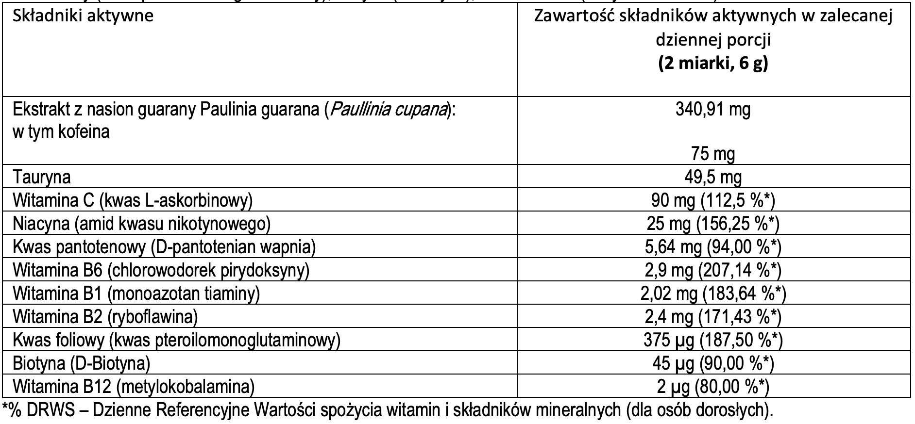 Składniki: dekstroza jednowodna, regulator kwasowości: kwas cytrynowy, ekstrakt z nasion guarany – Paulinia guarana (Paullinia cupana), aromaty: ananasowy, cytrynowy; witamina C (kwas L-askorbinowy), barwnik: beta-karoten, tauryna, niacyna (amid kwasu nikotynowego), kwas pantotenowy (D-pantotenian wapnia), substancja słodząca: glikozydy stewiolowe ze stewii, witamina B6 (chlorowodorek pirydoksyny), witamina B1 (monoazotan tiaminy), witamina B2 (ryboflawina), kwas foliowy (kwas pteroilomonoglutaminowy), biotyna (D-biotyna), witamina B12 (metylokobalamina).
